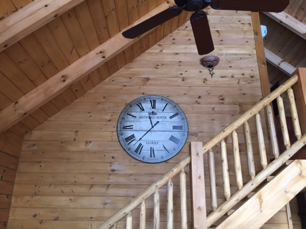That’s a picture of my new clock, custom made for the cabin. I needed to “white out” the address, because I’d have a thousand people camping out on the deck waiting for the next book. Well, okay, maybe not, but it doesn’t seem to be a great idea to post one’s address online. Anyway, that picture, and the one that follows are the first public glimpses of the cabin that Robin has spent so much time on. My writing oasis.